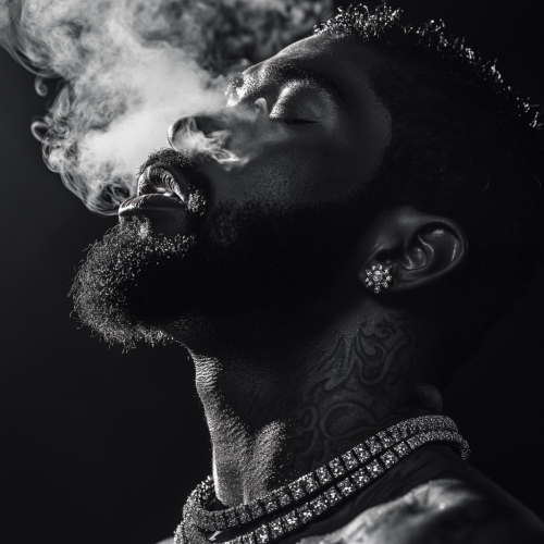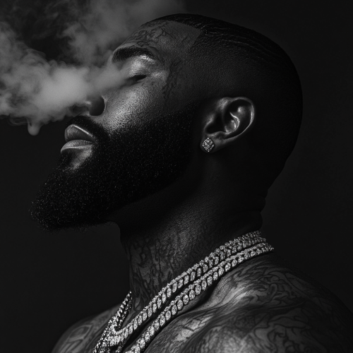 A black man with a thick beard and close cut, fine silky hair. He is wearing multiple diamond-studded chains around his neck with smoke coming from his nose and mouth ONLY--gently swirling! His DARK skin is adorned with intricate tattoos. The lighting is dramatic, highlighting his facial features and the textures of his tattoos and jewelry.