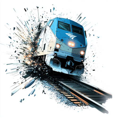 High-resolution logo on a white background, showing an anthropomorphized train bursting out of the tracks, with pieces of the track flying outward. The human-like face, with a metallic sheen or in a color like vibrant blue, electric silver, or dark gray, is fierce and focused, and the train's body is slightly arched as if lifting off the ground, giving a dramatic, powerful effect. The headlights cast beams of light forward, enhancing the intensity