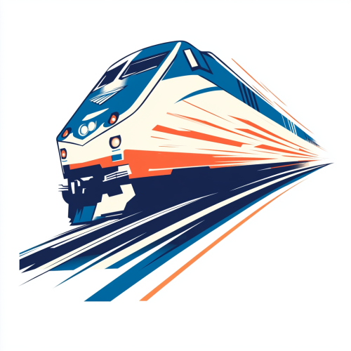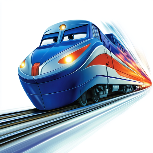 High-resolution logo on a white background, featuring an anthropomorphized train angled slightly to the side, charging forward down the tracks. The train has a recognizable human-like face, with clearly defined eyes, nose, and mouth, colored in vibrant blue or metallic silver, giving a determined expression. The body of the train is blurred slightly to emphasize motion, with visible tracks below and stylized motion lines suggesting speed and power