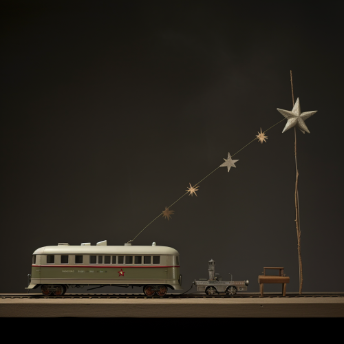 Toy atomic age train, fire, smoke, stars, --style 4aoSKtZni543wKpH