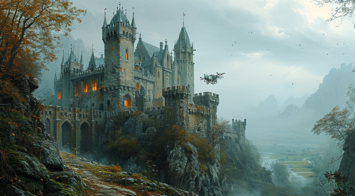 An action painting by famed Tolkien artist John Howe of a medieval noblewoman launching a Da Vinci flying contraption from a tall tower on a grey summer dawn from a broad tower of Burg Eltz Castle. Highly realistic. Extremely detailed. Fantasy theme. Grey tones. Grim outlook but showing rugged beauty. --ar 9:5 --stylize 450 --v 6.0