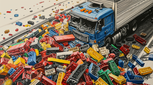a colored pencil drawing of a truck crashed and spilling lego all over the highway from the back of the truck, 16K --ar 128:71 --style raw --v 6.0