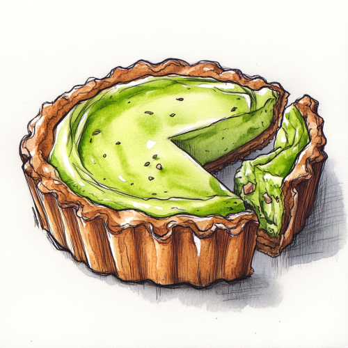 Pistachio tart drawn with a pen. Rough. I don't feel like I'm that good at it. The atmosphere is deliberately relaxed. Colored with watercolors. Background white.