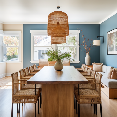A narrow dining room featuring a long dining table with seating for 16. The room showcases woven basket pendant lights hanging above the table, adding a rustic yet elegant touch. The style is transitional, leaning more towards a masculine aesthetic. The decor includes blue accents that provide a subtle and tasteful pop of color. The space is well-balanced, combining modern lines with classic elements, creating an inviting and sophisticated atmosphere.