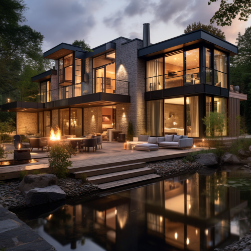 a watercolor architectural rendering showing the primary elevation of a forest cabin modern cabin with full vegetable gardens and a nearby lake --v 6.0