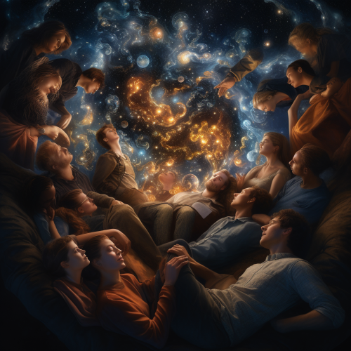 a hyper photorealistic small group of people lying together, with their heads in the center, in a wonderous nighttime dream circle, with a brighly lit, spectacular surrealist dreamtime thought bubble connecting them all