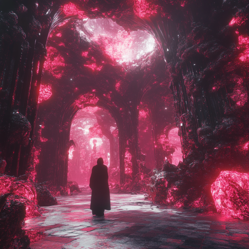 generate an environment in anime style, dreamlike space with demonic traits in it, there’s a subject in black clothes in the scenario and all the scenario looks creepy and dreamlike, NOT 3D art