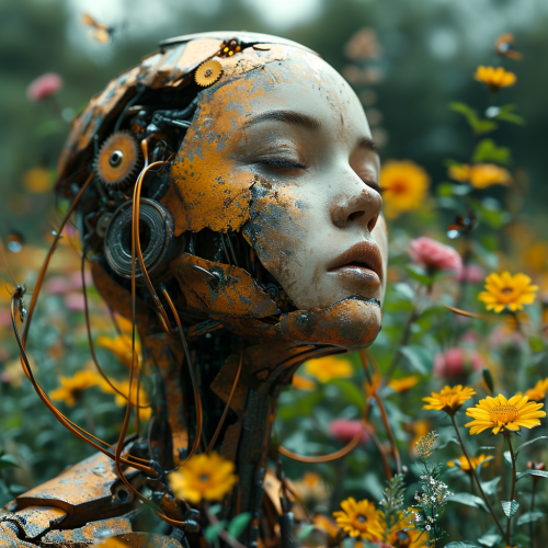The rusty dilapidated head of the cyborg bride lies in a flower meadow, sunflowers and fantastic flowers of amazing beauty with huge buds grow thickly around. A cyborg girl with a veil of gold threads on her head, through the cracks and cracks on her cheek it is visible that the cyborg bride is assembled from gold gears, springs, rollers, levers, couplings, gears, screws and rivets. Multicolored wires and cords are hair sticking out in different directions arranged in the form of a fashionable hairstyle. On the other half of the preserved face of the rusty cyborg bride, bright evening makeup and colorful tattoos, scars and piercings with precious stones and jewelry are visible. Thick purple-red smoke billows from the ear holes. Mechanical shiny insects, electric butterflies and dragonflies, neon beetles fly around the Cyborg. Roses, irises, gladioli, chrysanthemums grow all over the face, flowers grow from the nostrils, eyes and ears of the cyborg bride. She's looking up at the sky. High detail realism. High-quality generation with maximum resolution. --v 6.0 --s 750