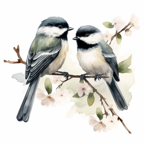 Cute Chickadee Birds Clipart Watercolor illustration, in the style of dreamy watercolor sences, eye-catching, whistlerian, romantic charm, heavy shading, cute and dreamy, green and cream , bioluminescent light, watercolor style, ultra realistic, hyper detailed, UHD, white background