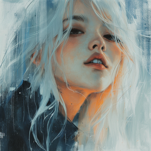 White hair, white teeth, black eyes, in the style of dreamy watercolor scenes, light sky-blue and dark orange, romantic graffiti, the pictures generation, gongbi, tattoo, photobashing --v 6.0