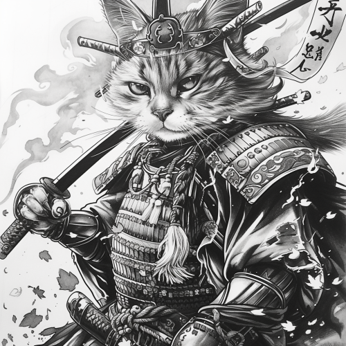 cat samurai tattoo design black and white sketch pencil drawing lineart coloring page manga style few details --v 6.0