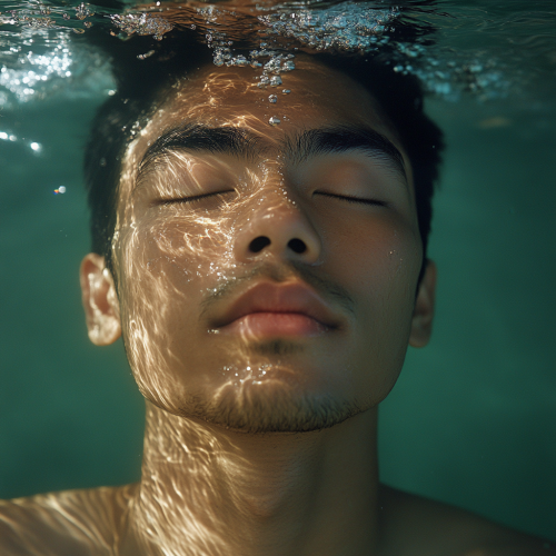 A young, baby-faced Malay man of about 20 years old is floating just beneath the surface of the water. His face, with typical Malay facial features, is calm and serene. His skin is smooth and light brown, with a soft glow from the light filtering through the water. His facial features include a rounder face with soft cheeks, slightly fuller lips, and almond-shaped eyes, which are gently closed as if in a peaceful sleep. His nose is rounded and fits perfectly with his youthful, innocent appearance. The water ripples gently around his face, creating delicate reflections of light and shadow that dance across his skin. Tiny bubbles rise from his slightly parted lips, and the water has a greenish, ethereal hue, enhancing the dreamlike, underwater atmosphere. The soft lighting illuminates the contours of his face and highlights the peaceful expression on his face. The mood is calm, mysterious, and meditative, as if he is in a deep state of serenity or suspended in time. The scene is mesmerizing and surreal, with the water adding an almost magical quality to the photograph.