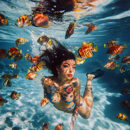 woman with tattoos swimming underwater by a school of colorful fish in the Caribbean ocean. Underwater photography. Award winning National Geographic photo. --v 6.1