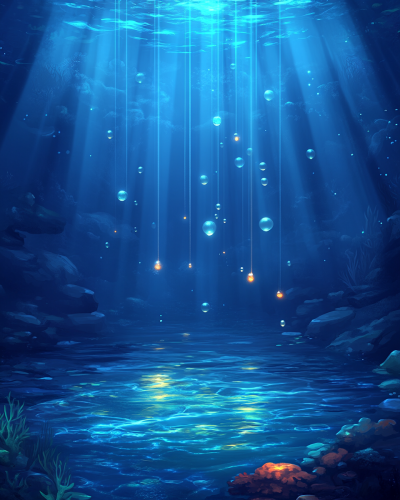 The scene is filled with lots of underwater plants, rocks, and small nooks and crannies where the creatures can hide. Bubbles of different sizes float upwards, creating movement in the illustration. - 3d animation style low poly