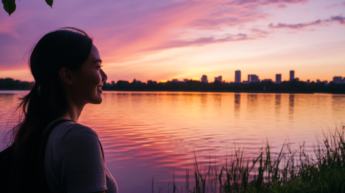 Hyper realistic photograph for news media of a woman with a gentle smile gazing at a beautiful lake during the magic hour, the soft glow of the sunset reflecting off the calm water, the silhouette of a distant city skyline visible on the horizon, warm hues of pink, orange, and purple filling the sky, a peaceful and serene atmosphere, the woman standing by the water’s edge, lost in thought, the harmony between nature and urban life creating a tranquil, awe-inspiring moment, Serene photo, these photographs taken with an SLR or mirrorless camera, --ar 16:9 --style raw --stylize 50 --no words text watermarks signatures captions subtitles scrolling-tickers logo-mark logo-text description commentary title-statement title-wording
