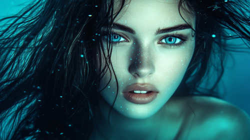 an underwater photograph of a beautiful woman with bioluminescent skin and long dark hair flowing languidly in the water. Detailed eyes and skin. --ar 16:9 --style raw