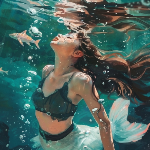a brunette woman floating underwater breathing though mermaid gills on her chest --v 6.0