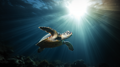 Capture the essence of an ethereal underwater moment in a subtly enhanced photograph. An HD image showcases a turtle gracefully ascending through a gentle beam of sunlight, taken from a distance that imparts a dreamlike quality. The background, a mainly empty sea with a few fish, provides a tranquil setting, and the sunlight's entrance into the water is the focal point, creating a soft, mystical atmosphere. Photography, use a Canon EOS R5 with a 70-200mm f/2.8 lens, apply a slight depth of field to soften the turtle and enhance the dreamy ambiance, --ar 16:9