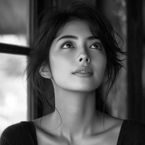 Black and white photography of an incredibly beautiful Japanese woman with a smile on her lips, half body shot, looking up with a dreamy emotion, professional light setting, natural light from window , studio photography, linear view, high detail, photo realistic --stylize 730 --v 6.0