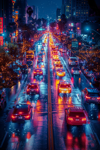 a drone top view of a car on a road in a night city looking like los angles, realistic, top view --ar 2:3 --style raw --v 6.0 --stylize 1000