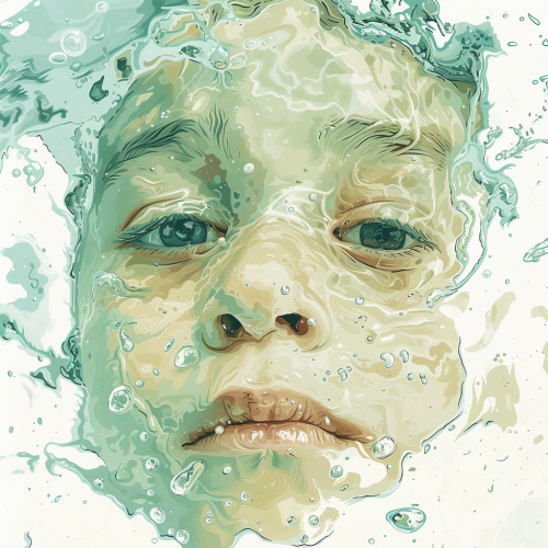 a portrait of a child with water on their face, in the style of cartoon like characters, light white and light green, subtle coloring, visual puns--ar 4:5 --v 6.0