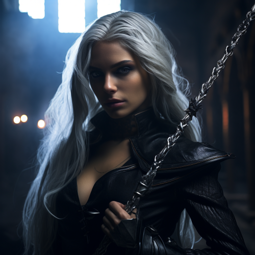 a half body shot of a beautiful female drow warrior in black leather armor, norse style, in the background is a mysteriously lit drow fortress, d&d digital painting --ar 2:3 --v 5.2