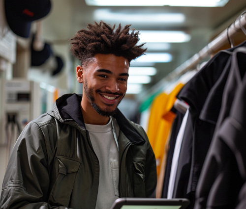 Photorealism a british mixed race male dry cleaning employee smiling while looking at a ipad that they are holding, standing behind a counter in a dry cleaning store, with dry cleaning hanging behind. Dressed in modern clothes. Soft natural light. Pair an outstanding high-resolution camera like the Hasselblad H6D-400c MS with a premium prime lens like the Hasselblad HC 80mm f/2.8 to deliver an exceptional level of detail and sharpness. The camera's remarkable 400-megapixel resolution, 15-stop dynamic range, and True Focus II autofocus system combine to create a stunningly realistic image. --ar 7:6 --style raw --v 6.0