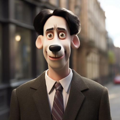 3d characters in the style of Aardman Animation. An animator is making a presentation to a panel