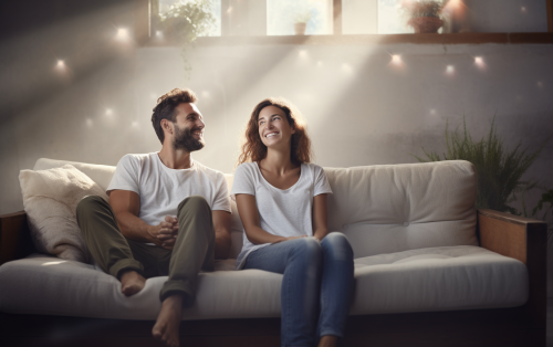 photo of a young woman and man sitting on a sofa, clean and modern, bright, beams of happiness, realistic --ar 16:10