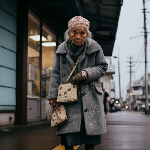 : photo with using Leica camera, street snap in japan, color photo, elderwoman, gloomy, front view, upright, full length, whole body to the toes,