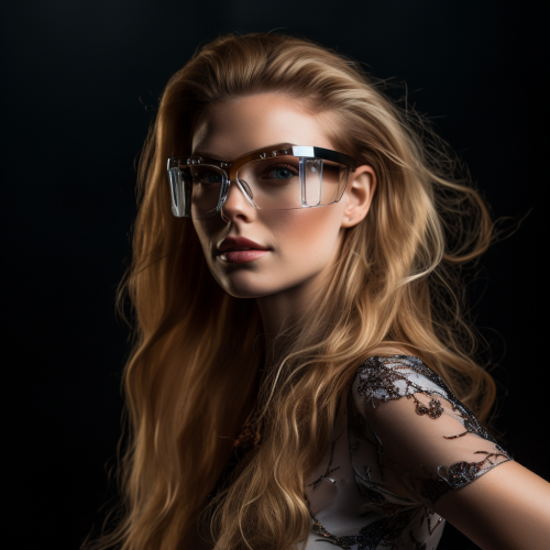 Professional photograph of a beautiful Gallic woman wearing AR glasses.