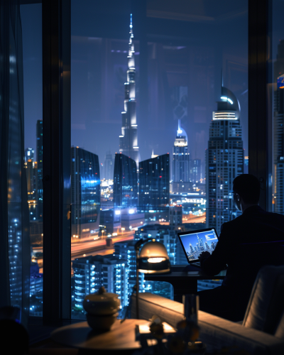 A business traveler in a high-rise hotel room overlooking Dubai’s skyline, his silhouette softly lit by the laptop screen, the Burj Khalifa visible in the distance through the panoramic windows, luxurious and modern decor, soft, ambient lighting, high resolution, calm and inspiring atmosphere, deep contrast, wide-angle view --ar 4:5 --v 6.0