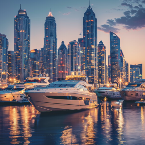A panoramic view of Dubai's skyline at twilight, showcasing luxurious high-rise apartments and commercial towers, the marina filled with yachts in the foreground, glowing city lights reflecting off the water, a scene of exclusive property investment in the heart of Dubai, wide-angle shot, HDR, cinematic quality, soft ambient glow --v 6.0