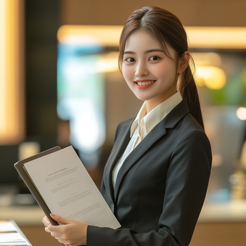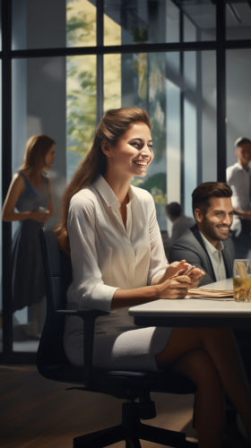 happy employees in an office, photo realistic, natural light, realism, 4k, --ar 9:16