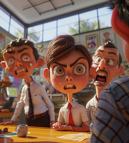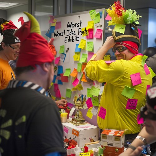 Worst Idea Fridays: Visualize a lively office scene where employees, dressed in their most outrageously creative costumes, pitch their "worst" ideas to an encouraging leader. The room is decorated like a party, with a "Worst Idea" trophy on display. One employee presents a mock-up of "Edible Post-its," while others around cheer and jot notes on giant sticky notes. The empathetic leader, dressed as a pirate captain, laughs heartily, doling out gold chocolate coins as rewards.