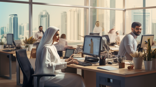 Dubai govrnemnt employees at work in the office mix of Emarati gentelmen and ladies --ar 16:9