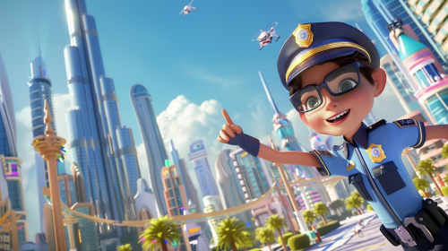 pixar and netflix collaboration for a detective kid animation series that take place in dubai. color are vibrant and the overall feel of the image is positive and intriguing. in the image we can see an emirati kid wearing kandora working with a Dubai police officer wearing the official dubai police officer uniform. they are both smiling. the kid and the police officer are superheroes --ar 16:9