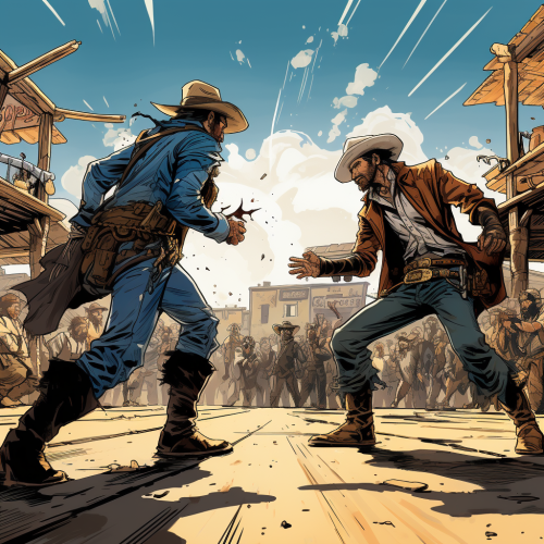 worm's eye view rule of thirds night dark forest bedroll campground. two 1880 western gunfighters are silhouettes against a fire buring out of control. one gunfighter has fired a gunshot into the other gunfighter's chest-- ar 16:9 --v 6.1 --style raw
