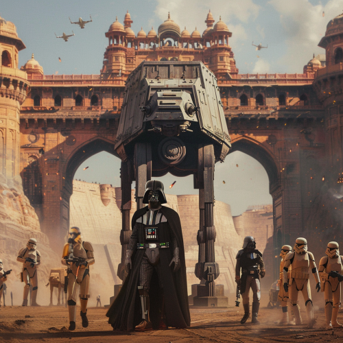 Create a vivid and realistic scene set in the 1990s, blending the magic of Indian themes with the epic allure of a Star War. Picture iconic Star Wars characters in this nostalgic era, rad fort, infusing cultural elements and letting the cosmic drama unfold against the backdrop of an iconic Indian setting. Transport your audience to a time when stars aligned with our imaginations, bringing to life a unique fusion of galactic fantasy and 1990s charm