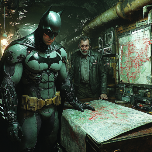 An underground hideout, dimly lit, filled with maps, broken gadgets, and high-tech equipment. Batman, in a damaged suit, leans over a large table filled with city plans, his expression focused. Alfred stands nearby, aged and worried. In the background, a large map of Gotham City with red marks indicating dangerous zones, with Arkham Asylum circled. The atmosphere is tense, with a sense of strategy and urgency. Cinematic lighting, high detail, 16:9 ratio. --v 6.1 --s 750 --style raw