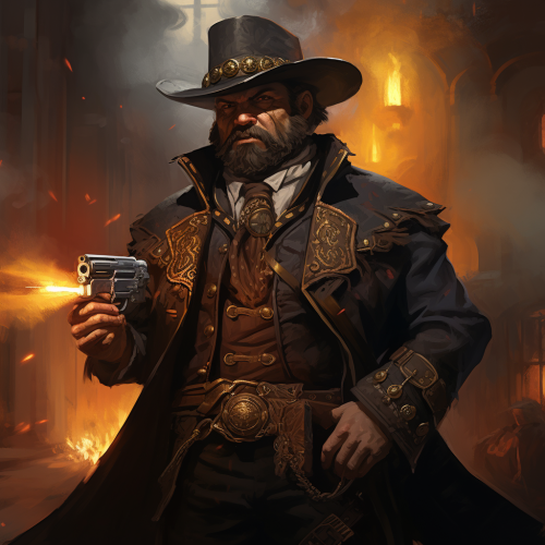 dark dwarf, cowboy, gunslinger, cigar in mouth, walking, holding revolvers, dungeons and dragons
