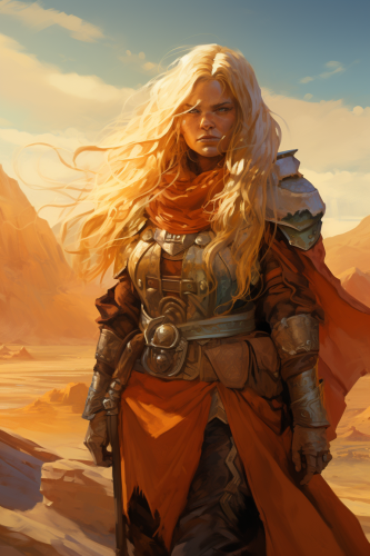 trading card dungeons and dragons character design, young woman warrior dwarf with A giant Axe,warm color palette, Frank thorne artwork --v 6.1 --ar 9:16