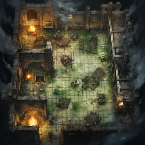 dungeons and dragons battlemap, gridded 30x30, 4k, side of falling building, windows, ruination, topdown visual, burning, green flames, rubble, tactical, cover, watercolor