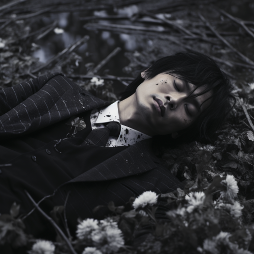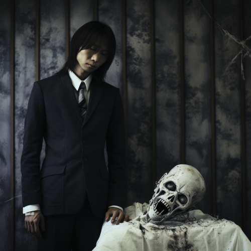 Create a photo. The theme is Osamu Dazai and Junji Ito's work of 'No Longer Human'. Relect the feeling of death and desperate.