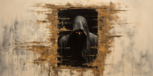 Style of Medieval Bold brush stroke acrylic painting ,a head of black hooded man peeping though the destroyed wall, destroyed wooden door --ar 2:1
