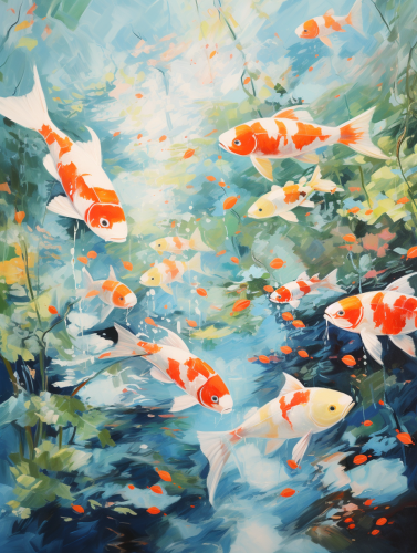 Style of Bold brush stroke acrylic painting ,lots of fishes floating on the river, electric pulse on the river, spring season --ar 3:4