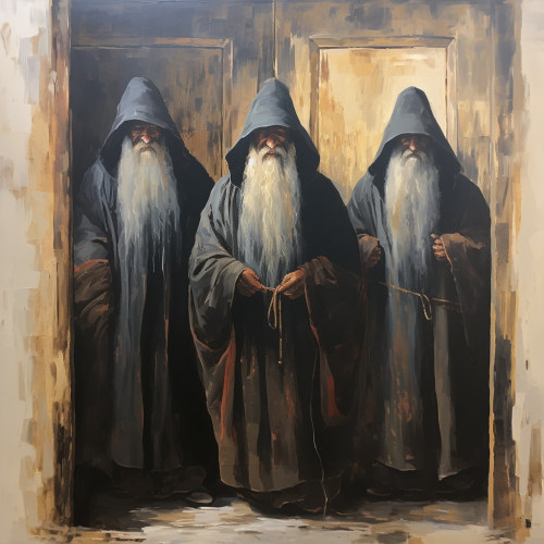 Style of Medieval Bold brush stroke acrylic painting , three old men with black hood and long grey beard, wooden door