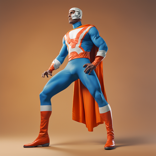 Dutch super hero wearing clogs and a tight orange, blue, white clothing
