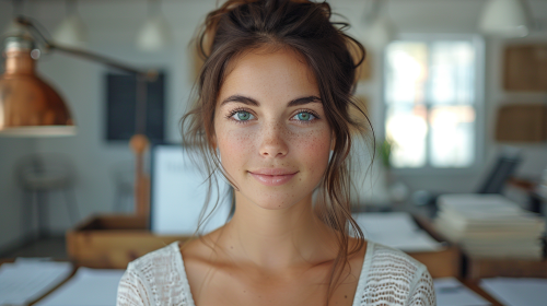 a super hyper-realistic frontal medium shot of a spanish regular black hair woman in his 45s, poised in front of an office desk. His gentle smile and wise eyes suggest a moment of reflection. The desk, laden with papers and a vintage lamp, provides a warm, illuminating glow office interior. Captured Using iphone camera, ultra-high resolution, dynamic lighting, vibrant color saturation, meticulous detail, natural depth of field --ar 16:9 --v 6.0 --s 1000 --style raw --c 10