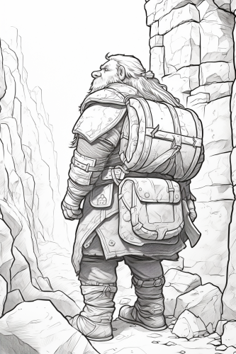 Dwarf warrior with back to camera as he looks up at underground stone wall, backpack, shield, waterskin, scabbard, sword, axe, black and white, fantasy, dungeons and dragons, high detail, simple line drawing --ar 2:3